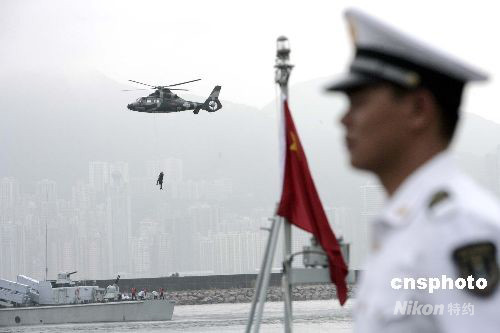 圖為駐港部隊(duì)槍械團(tuán)體操表演。中新社發(fā) 張勤 攝