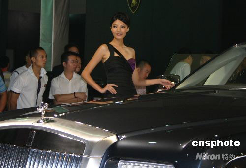 第11屆成都國際車展向媒體開放,一美女車模著“稻草”裝現(xiàn)身。 中新社發(fā) 霍潺 攝