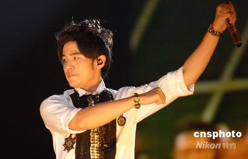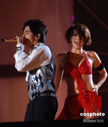 9月20日19時30分,“2008周杰倫世界巡回演唱會”在西安陜西省體育場演出。周杰倫在演唱會上大秀“奧運加油操”。中新社發(fā) 李海軍 攝