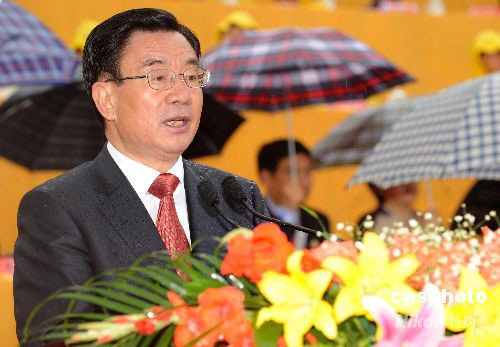 中央代表團(tuán)團(tuán)長(zhǎng)、中共中央政治局常委、中央紀(jì)委書(shū)記賀國(guó)強(qiáng)在大會(huì)上作重要講話。中新社發(fā) 廖攀 攝