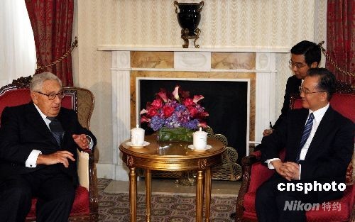 中國總理溫家寶23日在紐約會(huì)見美國前國務(wù)卿基辛格。中新社發(fā) 李靜 攝