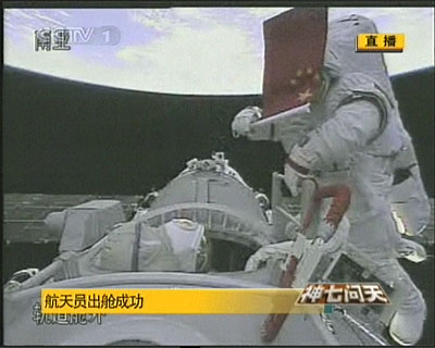 9月27日,“神七”航天員翟志剛在艙外活動,展出五星紅旗。