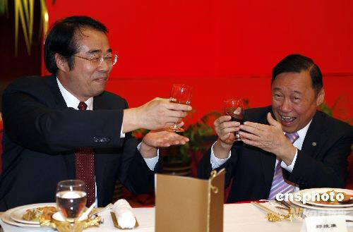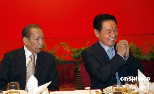 圖為國務(wù)院僑辦原主任、中國僑商投資企業(yè)協(xié)會名譽會長郭東坡(右)和東南亞知名僑領(lǐng)唐裕出席招待午宴。