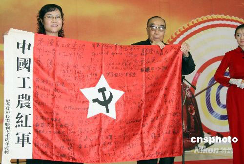 10月1日上午,神舟七號載人飛船返回艙在其誕生地——中國航天科技集團公司所屬中國空間技術(shù)研究院舉行開艙暨搭載物交接儀式,伴隨三位中國航天員太空飛行六十八小時二十七分鐘的一批特殊“乘客”一一精彩亮相,隨后各歸其主。圖為新中國首任駐美大使柴澤民(中)現(xiàn)場移交并展示隨“神七”飛天的中國工農(nóng)紅軍軍旗。中新社發(fā) 孫自法 攝