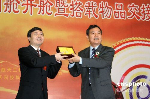 10月1日上午,神舟七號(hào)載人飛船返回艙在其誕生地——中國(guó)航天科技集團(tuán)公司所屬中國(guó)空間技術(shù)研究院舉行開艙暨搭載物交接儀式,伴隨三位中國(guó)航天員太空飛行六十八小時(shí)二十七分鐘的一批特殊“乘客”一一精彩亮相,隨后各歸其主。圖為中國(guó)載人航天工程辦公室主任王文寶(右)福建省有關(guān)方面移交錄有海峽兩岸民眾祝福語音并隨“神七”飛天的U盤。中新社發(fā) 孫自法 攝