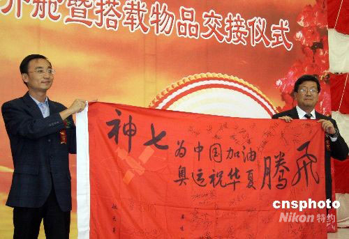 10月1日上午,神舟七號(hào)載人飛船返回艙在其誕生地——中國(guó)航天科技集團(tuán)公司所屬中國(guó)空間技術(shù)研究院舉行開(kāi)艙暨搭載物交接儀式,伴隨三位中國(guó)航天員太空飛行六十八小時(shí)二十七分鐘的一批特殊“乘客”一一精彩亮相,隨后各歸其主。圖為“神七”載人飛船總設(shè)計(jì)師張柏楠(右)向中國(guó)航天報(bào)社移交返回艙搭載的一面簽名旗幟。中新社發(fā) 孫自法 攝