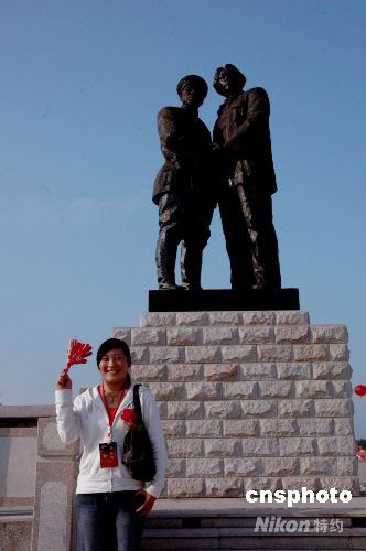 十月七日,一尊重五點(diǎn)四噸,高五點(diǎn)八米朱德和毛澤東會(huì)師的大型銅像,在井岡山龍市朱毛會(huì)師廣場(chǎng)揭幕,銅像吸引了眾多的中外游客觀賞和拍攝。中新社發(fā) 段長(zhǎng)征 攝