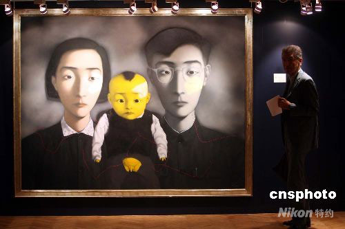 十月八日,香港佳士得推出一批即將在秋季拍賣的頂級當代藝術(shù)品,總值約四千萬港元,其中還有著名好萊塢導演奧利弗·史東(Oliver Stono)私人收藏的張曉剛油畫作品《血緣:大家庭之二》。佳士得表示,該藝術(shù)品沒有估價,屆時將由買家出價,價高者得。中新社發(fā) 洪少葵 攝