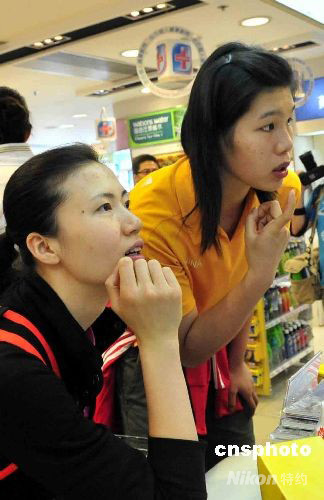 十月九日,中國女排展開訪問香港之旅,圖為隊員周蘇紅(左)等在商場選購化妝品。中新社發(fā) 譚達明 攝
