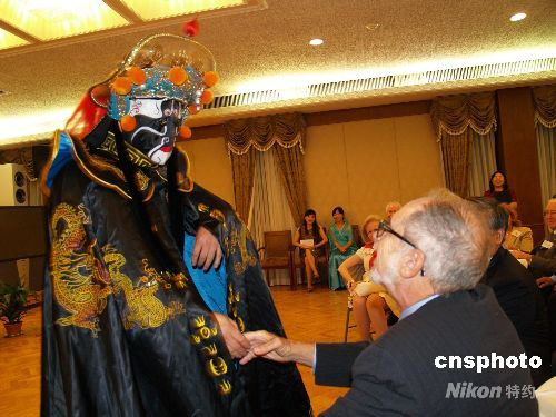 當(dāng)?shù)貢r間10月8日,中國駐洛杉磯總領(lǐng)館舉行“紀(jì)念中美建交30周年茶話會”,洛杉磯世界事務(wù)委員會的美國朋友約一百多人參加了茶話會,共同暢談中美建交30年來的友誼。旅美京劇演員劉小任表演“變臉”,贏得滿堂喝彩。 中新社發(fā) 盧威 攝