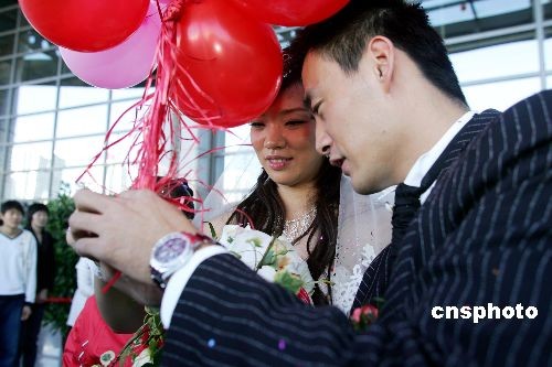 10月10日,中國的跆拳道兩屆奧運冠軍陳中在北京舉行婚禮。陳中的新郎是她的陪練、煙臺帥氣小伙車新港。中新社發(fā) 富田 攝