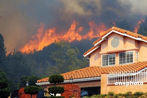 當?shù)貢r間十月十四日中午,消防直升機在洛杉磯附近的山火現(xiàn)場實施空中滅火,大批消防員在地面阻止火勢蔓延。從周一開始,洛杉磯市西北約三十多公里的山區(qū)接連發(fā)生多起山火,由于當?shù)毓纹鸫箫L,火勢迅速蔓延,難以控制。截至周二下午,過火面積已超過一萬四千英畝,山火已造成兩人死亡、四十九棟建筑物被焚毀,上千居民被迫緊急撤離。加州州長施瓦辛格周一已宣布洛杉磯和溫圖拉縣進入緊急狀態(tài)。中新社發(fā) 張煒 攝