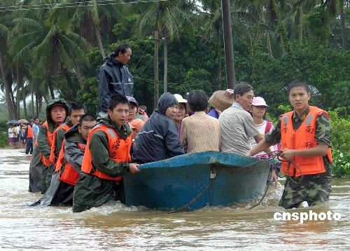 圖為十四日文昌邊防官兵雨中用沖鋒舟轉(zhuǎn)移文昌南陽辦事處桃村被洪水圍困的兩百多名村民。