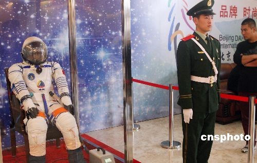 10月16日,2008北京大紅門國際服裝節(jié)暨文化創(chuàng)意論壇在北京開幕,服裝節(jié)圍繞“品牌、時尚、活力”主題,利用多載體、多形式、多角度開展系列活動。圖為在北京大紅門國際服裝節(jié)開幕式上展示中國“神七”艙內(nèi)航天服。中新社發(fā) 錢興強(qiáng) 攝