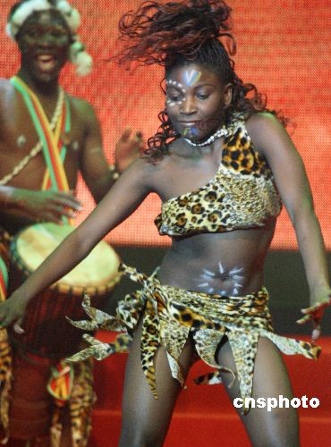 10月16日晚,2008北京大紅門國際服裝節(jié)開幕晚會在北京舉行,晚會匯聚中外模特,展示歐、美、亞時裝新款作品,來自加拿大THE KILL KENNYS樂隊、非洲AFRIACANRYTHM樂團以及中國內地歌手等參加演出。圖為非洲歌舞助興北京大紅門國際服裝節(jié)。中新社發(fā) 錢興強 攝