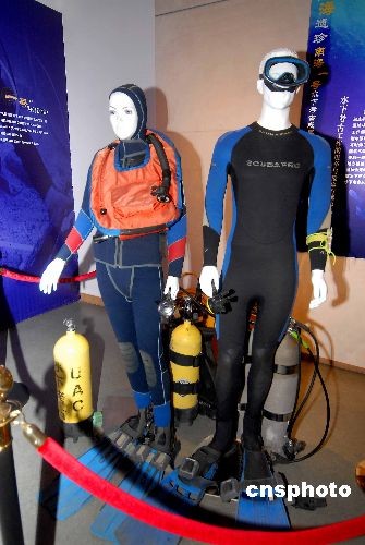 2008年10月20日,《南海驚夢(mèng)——“南海一號(hào)”》在杭州南宋官窯博物館臨時(shí)展廳正式展出。圖為打撈“南海一號(hào)”時(shí)考古人員使用過(guò)的潛水裝備。 中新社發(fā) 引煒 攝