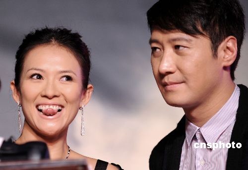 10月21日,章子怡、黎明合作電影《梅蘭芳》主題曲MV發(fā)布會在北京舉行。章子怡在黎明前做鬼臉,戲里戲外兩人都顯得默契。中新社發(fā) 廖攀 攝