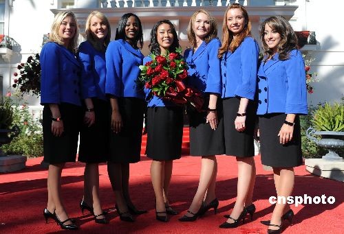 十七歲的華裔高中生李君慧(中)十月二十一日當(dāng)選二00九年度美國(guó)“玫瑰皇后”,她將引領(lǐng)二00九年元旦舉行的第一百二十屆帕薩迪納玫瑰花車大游行和九十五屆“玫瑰碗”杯美式足球總決賽。中新社發(fā) 張煒 攝