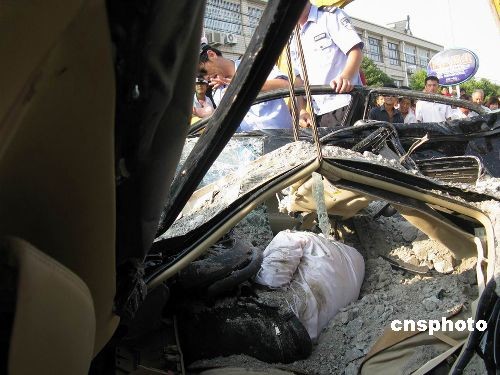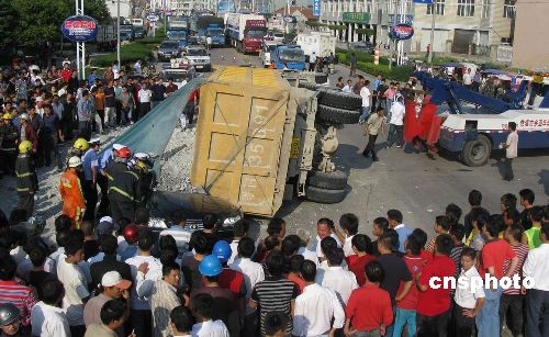 10月21日下午14時左右,一輛滿載泥土的貨車在浙江省慈溪市蘆庵公路發(fā)生側(cè)翻事故,將一輛轎車?yán)卫螇鹤。蓢嵉哪嗤翉能嚿蟽A瀉而下,造成轎車司機死亡。目前,事故原因在進(jìn)一步調(diào)查中。中新社發(fā) 何蔣勇 攝