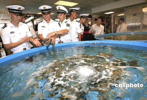 圖為官兵們?cè)诳拼蠛0逗Q髮?shí)驗(yàn)室參觀。