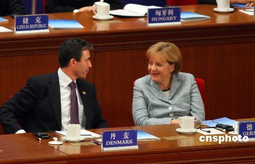 德國(guó)總理默克爾與丹麥?zhǔn)紫嗬鼓律陂_幕式上相談甚歡。中新社發(fā) 廖文靜 攝