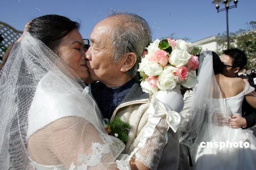 10月26日,11對(duì)來自全國(guó)各地的新人在北京舉行集體婚禮;槎Y中,中央美術(shù)學(xué)院的吳介琴教授是所有新人里年齡最大的,今年已經(jīng)81歲了。他的愛人蔣曉輝女士今年58歲,兩人相識(shí)于網(wǎng)絡(luò)。