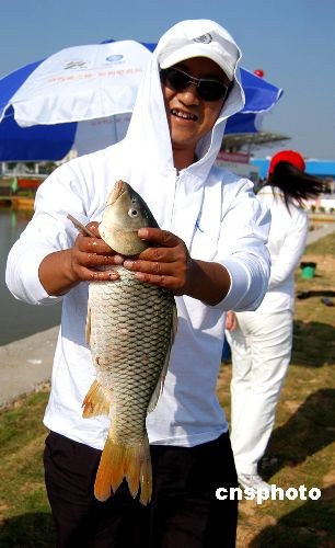 圖為手桿釣混合魚單尾重量比賽上,釣到大魚的湖北選手樂開懷。
