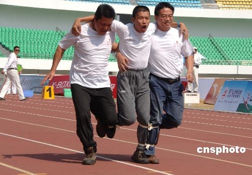 十月二十八日,臺灣選手邱學申、梁世英、汪勛武(中)在農(nóng)運會“男子60米3人四足跑”比賽中同心協(xié)力爭向前。賽后汪先生在接受媒體采訪時說:這是他第二次參加全國農(nóng)運會,上一屆他是以臺灣游泳隊領隊身份參賽。中新社發(fā) 鄭祚聲 攝