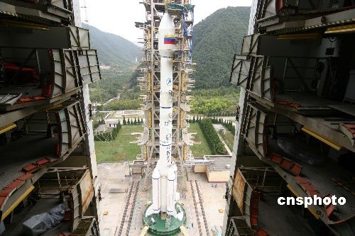 發(fā)射前星箭組合體倚天而立、蓄勢(shì)待發(fā)。中新社發(fā) 尹濤 攝