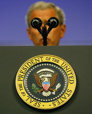 布什在美國(guó)海外退全軍人協(xié)會(huì)全國(guó)大會(huì)上發(fā)表講話時(shí),麥克風(fēng)恰好擋住了他的眼睛。作者:旺仔