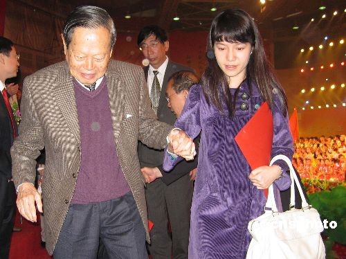 11月1日,在西南聯(lián)大在昆建校70周年在會上,楊振寧夫婦甫一出現(xiàn),立刻成為媒體關注的焦點。面對頻閃不斷的鎂光燈,楊振寧夫婦面帶微笑,極為配合。大會結束后,在翁帆的攙扶下,楊振寧走下主席臺。中新社發(fā) 劉子倩 攝