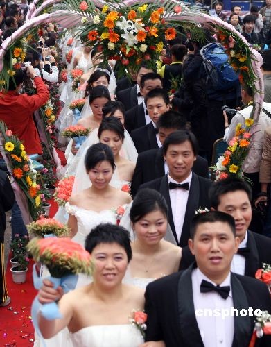 11月2日,重慶農(nóng)民工日,重慶市為當(dāng)?shù)剞r(nóng)民工舉行集體婚禮,30對(duì)進(jìn)城務(wù)工青年在眾多市民見證下結(jié)為連理。從2007年開始,重慶市將每年11月的第一個(gè)星期日設(shè)為“重慶農(nóng)民工日”,以紀(jì)念農(nóng)民工對(duì)該市社會(huì)和經(jīng)濟(jì)發(fā)展所做的貢獻(xiàn)。中新社發(fā) 郭晉嘉 攝