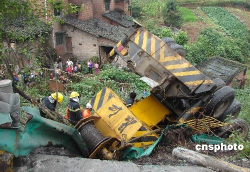圖為事故吊車撞出護(hù)欄側(cè)翻。