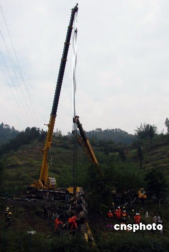 11月2日11時50分許,渝黔高速公路重慶至一品段10公里處,一輛長江牌吊車因爆胎導(dǎo)致車輛失控,沖出護(hù)欄發(fā)生側(cè)翻,造成1人死亡,1人重傷。中新社發(fā) 張東清 攝