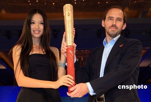 11月3日晚,一場(chǎng)預(yù)防性病艾滋病慈善拍賣晚會(huì)在上海舉行,中國(guó)“小巨人”姚明簽名的北京奧運(yùn)火炬,經(jīng)過激烈競(jìng)拍,以10萬元人民幣被一位外籍愛心人士拍得,捐贈(zèng)給中國(guó)預(yù)防性病艾滋病基金會(huì),圖為2007年“世界小姐”張梓琳親手向愛心人士呈上姚明簽名的“奧運(yùn)火炬”。