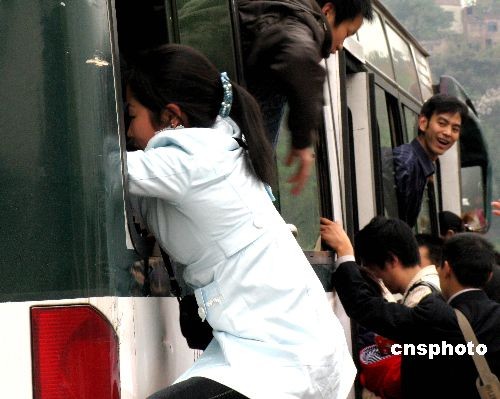 重慶主城區(qū)出租車(chē)罷運(yùn)事件11月4日上午仍在持續(xù),但從重慶市出租汽車(chē)協(xié)會(huì)了解到,截止4日下午16點(diǎn)30分,重慶主城區(qū)共有4000多輛出租車(chē)上路營(yíng)運(yùn),占全市主城區(qū)出租車(chē)數(shù)量的一半,持續(xù)到4日上午的罷運(yùn)事件出現(xiàn)良好轉(zhuǎn)機(jī),但仍嚴(yán)重影響市民出行,在南坪區(qū)出現(xiàn)了部分市民為了趕車(chē)回家攀爬公交車(chē)的情景。中新社發(fā) 許康平 攝