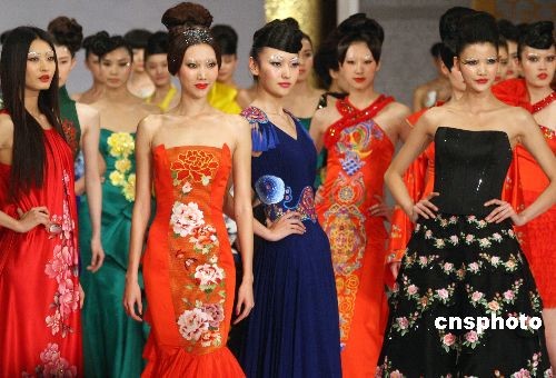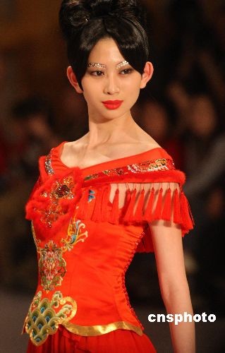 11月5日晚,北京舉行的中國國際時裝周(2009春夏系列發(fā)布),上演了一場華服大典!皣煜 華服大典”以緙絲傳承歷史,以牡丹展現(xiàn)盛世繁華,續(xù)寫中國奢侈品文明復(fù)興的傳奇。圖為模特展示2009華服大典作品。中新社發(fā) 錢興強(qiáng) 攝