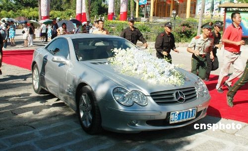 11月6日,2008北京奧運(yùn)會(huì)體操“全能王”在海南三亞著名的天涯海角景區(qū)的沙灘上舉行盛大浪漫的婚禮,與新娘楊云經(jīng)過(guò)8年的愛(ài)情長(zhǎng)跑,終于走進(jìn)婚姻的殿堂。圖為楊威迎娶楊云的豪華婚車。中新社發(fā) 尹海明 攝
