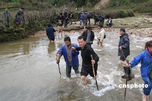 11月2日,云南楚雄發(fā)生泥石流災害,多條進入災區(qū)的道路塌方中斷。楚雄州市官員徒步17個小時進入災區(qū)一線,指揮救援工作。圖為楚雄市市長袁鵬(圖正中者)赤腳淌水過河,步行7個半小時從災區(qū)返城布置下一步的救援工作安排。他表示,隨著道路搶修里程增加,大量的救援物資將陸續(xù)運入災區(qū),保證不讓一位災民在寒冷中過冬。