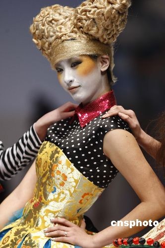 11月10日,一場(chǎng)被命名為“優(yōu)雅時(shí)尚的英倫風(fēng)暴”主題的發(fā)布會(huì)在中國(guó)國(guó)際時(shí)裝周上推出。讓觀眾不只是欣賞到服裝的絢麗動(dòng)人,彩妝的美麗也是一樣的奪人心弦此次發(fā)布會(huì)更是凸顯這一特點(diǎn)。宛如詭異絢爛的愛麗絲夢(mèng)境,造型在天真甜美中進(jìn)行夸張怪誕的演繹。中新社發(fā) 盛佳鵬 攝