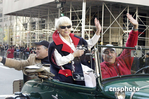 11月11日,紐約在曼哈頓第五大道上舉行一年一度的退伍軍人節(jié)大游行,今年已是第90屆。第二次世界大戰(zhàn)經(jīng)典照片《時代廣場勝利之吻》的女主角、九十歲的美國老嫗埃迪特·卡倫·沙因也現(xiàn)身游行隊伍當(dāng)中。