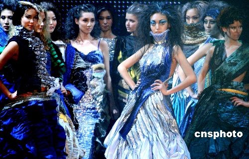 11月11日晚,在北京舉行的中國國際時裝周2009春夏系列發(fā)布上,推出了一場名為長江的2009春夏高級時裝發(fā)布會。作者以長江景象、長江技藝、長江情懷為創(chuàng)意主題,以時裝創(chuàng)作藝術(shù)手法表現(xiàn)中華民族豐富絢麗的文化。圖為模特展示2009春夏《長江系列》高級時裝發(fā)布新款。中新社發(fā) 錢興強(qiáng) 攝