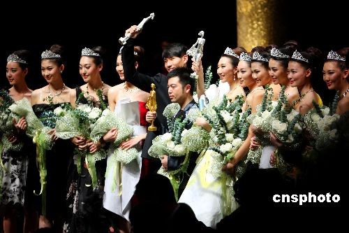 11月12日,中國國際時裝周(2009春夏系列發(fā)布)在北京落幕,女模劉多、男模孟飛分別獲得2008年度中國最佳模特,著名設(shè)計(jì)師祈剛獲得代表中國服裝設(shè)計(jì)最高獎項(xiàng)的“金頂獎”。中新社發(fā) 盛佳鵬 攝