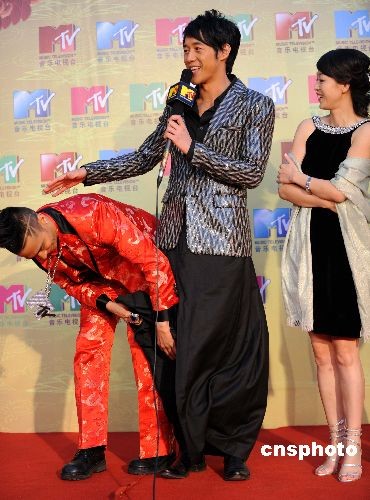 十一月十六日晚,第九屆CCTV-MTV音樂(lè)盛典在北京舉行,穿裙子的MTV男主持人被人掀裙打趣。中新社發(fā) 廖攀 攝