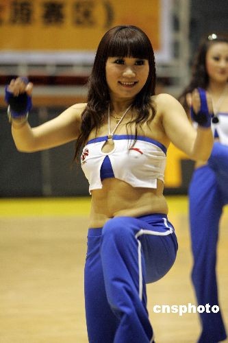 11月19日晚,CBA08-09賽季第二輪比賽打響,山西中宇坐陣山西財經(jīng)大學體育館主場迎戰(zhàn)八一隊。圖為現(xiàn)場正在勁歌熱舞的靚麗籃球?qū)氊。中新社發(fā) 張云 攝