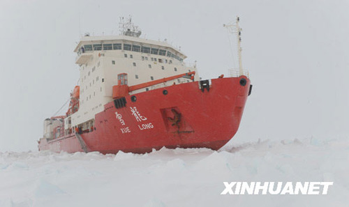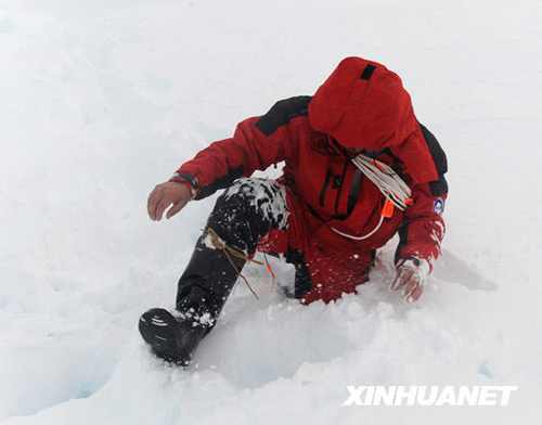由于南極大陸周?chē)嗄晡椿摹袄媳焙蛣倓偨Y(jié)成的“新冰”混合一起,堵死了“雪龍”號(hào)前進(jìn)的航線(xiàn),25日晚6時(shí),“雪龍”號(hào)有關(guān)負(fù)責(zé)人決定由船上隊(duì)員組成探冰隊(duì)下船察看冰情。
