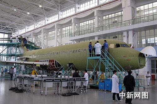 中國商飛上海飛機(jī)制造廠ARJ21總裝生產(chǎn)線,科研人員正在總裝ARJ21-700新支線飛機(jī)。