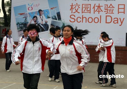 圖為一名同學(xué)眼蒙眼罩,在伙伴帶領(lǐng)下體驗(yàn)盲人賽跑。中新社發(fā) 郭晉嘉 攝