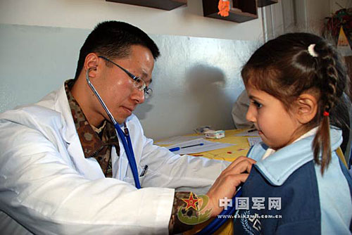 今天體檢的是該校幼兒園的小朋友。上午9點(diǎn)開始,中國維和軍醫(yī)對孩子們的身高、體重、五官、內(nèi)科、外科進(jìn)行了全面體檢,并將檢查結(jié)果詳細(xì)記錄,交給該校老師存檔。皮膚科、婦科醫(yī)生則為慕名而來的當(dāng)?shù)厝罕娺M(jìn)行了義診。至中午12點(diǎn),中國醫(yī)護(hù)人員共為該校幼兒園的100余名小朋友進(jìn)行了體檢,治療20余名皮膚、婦科患者。