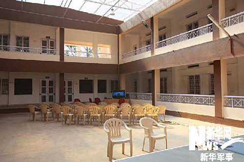 中方參訓(xùn)官兵的宿舍是棕灰色二層院落式樓房,中間有一個(gè)大天井,可以在這里集合或者進(jìn)行一些簡單的娛樂。
